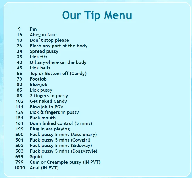 Doggy Style, Ahegao, Blowjob, Deepthroat, Flashing, Fingering, Handjob, Masturbation, Cowgirl, Dildo or Vibrator, Sex Toys, 69 Position, Pussy Licking, Precum, Footjob, Spanking, Rimming, Camel Toe, Topless, Cock Rating, Cuckold, Facesitting, Foot Fetish, Nipple Toys, SPH, Heels, Massage, Orgasm, Humiliation, Tittyfuck, Oil Show, Nylon, Gagging, Upskirt, Mistress, Kissing, Erotic Dance, CEI, Striptease, Jerk-off Instruction, Role Play, Yoga, Hardcore, Anal Toys, Rubbing